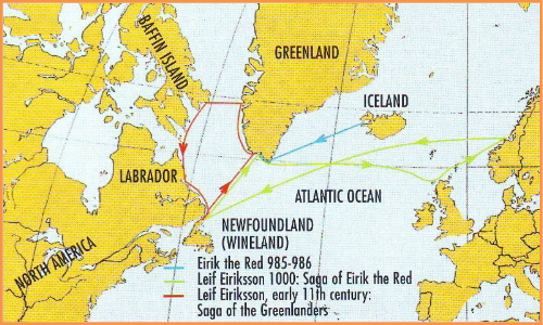 I Eirik Raudes saga som ble skrevet ned på 1200-tallet, står det detaljer om Eirikssons reise, og de skal visstnok ha drevet av kurs på veien hjem mot Grønland. Etter å ha drevet en stund kom de frem til det nordamerikanske kontinentet. De gikk mest sannsynlig i land der området Nova Scotia ligger i dag, og Eiriksson kalte dette landet for «Vinland», antageligvis fordi det grodde ville druer der de befant seg.