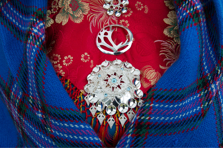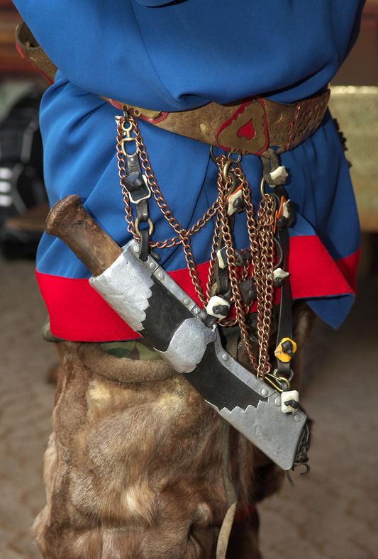 I antrekket hører det med en kniv, og på bildet over ser du et eksmpel på en vakker samisk sølje. Samene er kjente for sin sølvsmedkunst.